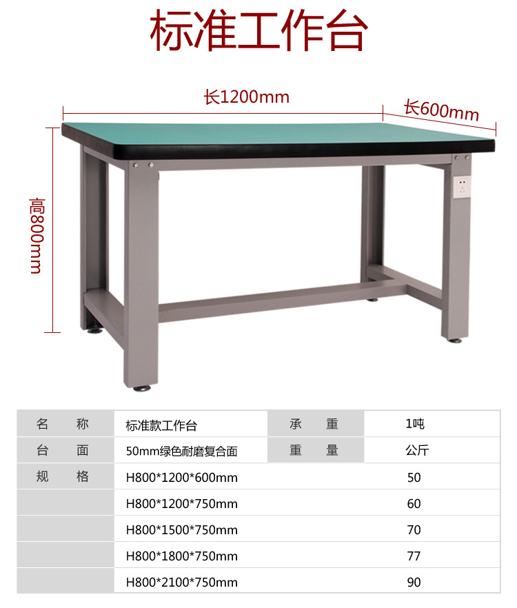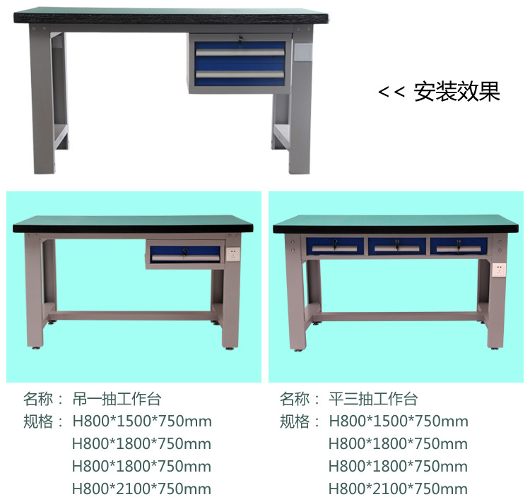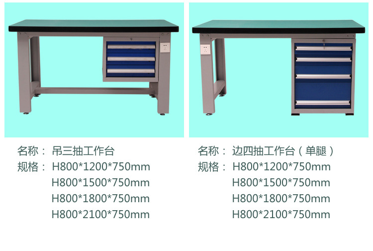 工作台采用优质冷扎板精工制作而成,坚固的工作桌框架,牢固平稳,可使工作桌承重1000kg;多种工作桌面选择,可配合不同使用的要求;工具吊柜(箱),侧柜(箱)灯架,调节脚杯,,外形美观;层板,抽屉质量上乘,承重大,抽屉内可根据需要任意分隔;节约空间,适用性强。